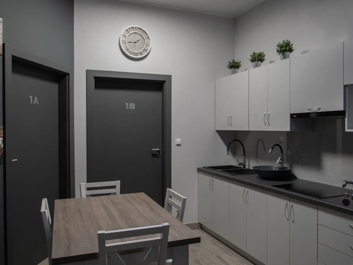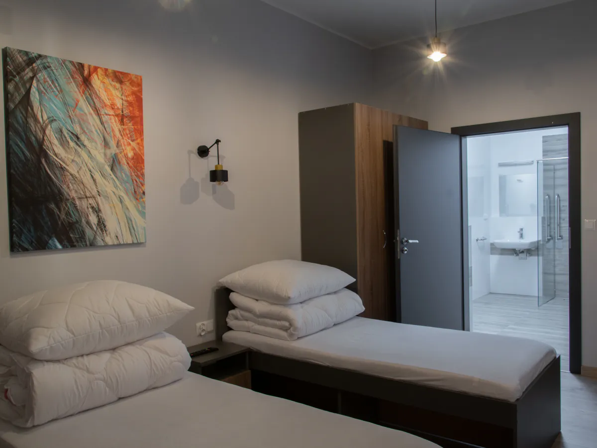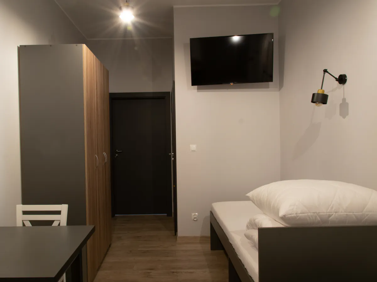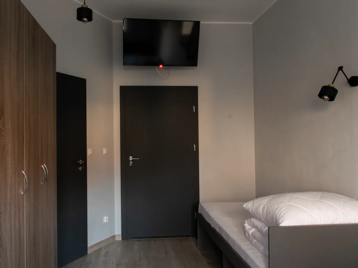 W naszej ofercie znajdziesz nowoczesne oraz wygodne pokoje z łazienkami, wyposażone w telewizory ze Smart TV. Dodatkowo do pokoi przylegają aneksy kuchenne, w których znajdziesz wszelkie potrzebne sprzęty AGD. Dla Gości preferujących bardziej ekonomiczne rozwiązania oferujemy również pokoje z dostępem do wspólnej łazienki i aneksu kuchennego na piętrze.