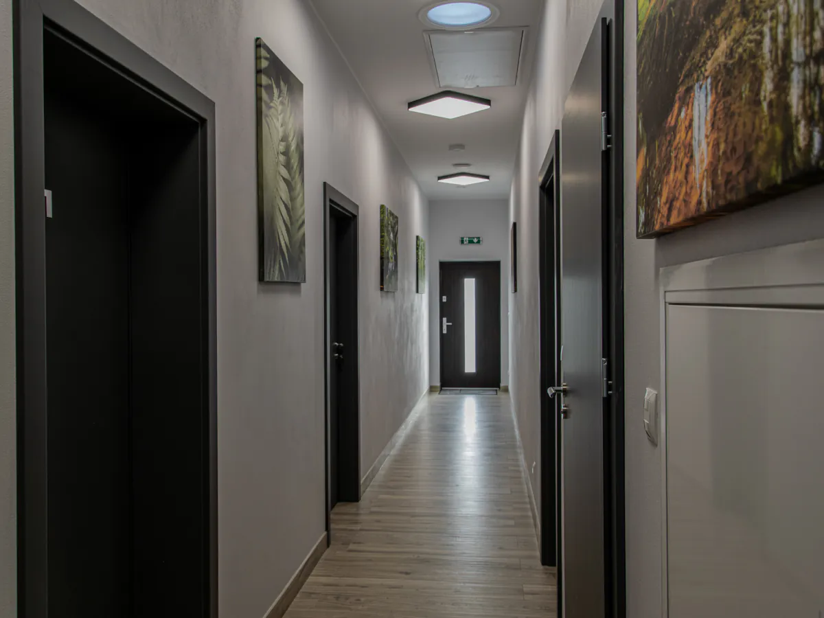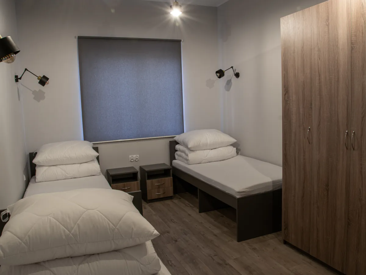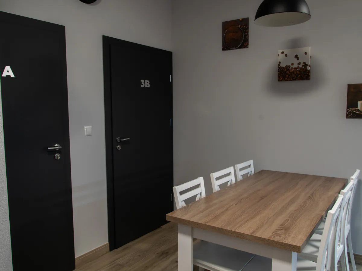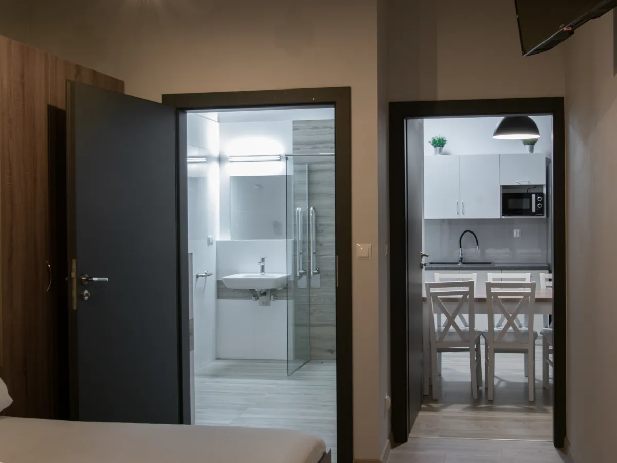 W naszej ofercie znajdziesz nowoczesne oraz wygodne pokoje z łazienkami, wyposażone w telewizory ze Smart TV. Dodatkowo do pokoi przylegają aneksy kuchenne, w których znajdziesz wszelkie potrzebne sprzęty AGD. Dla Gości preferujących bardziej ekonomiczne rozwiązania oferujemy również pokoje z dostępem do wspólnej łazienki i aneksu kuchennego na piętrze.