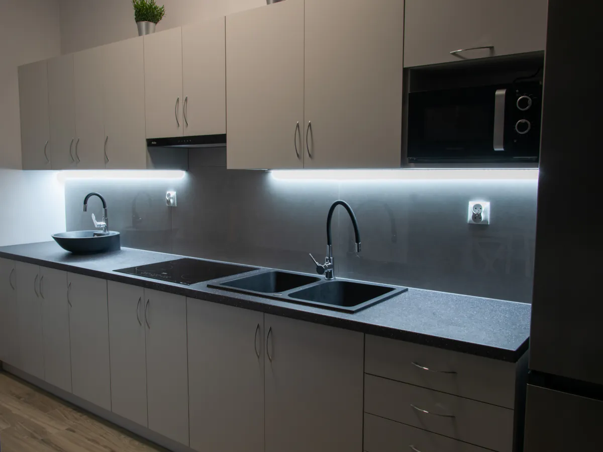 W każdym aneksie znajdziesz niezbędne sprzęty AGD takie jak: lodówka, kuchenka indukcyjna, kuchenka mikrofalowa i czajnik elektryczny.