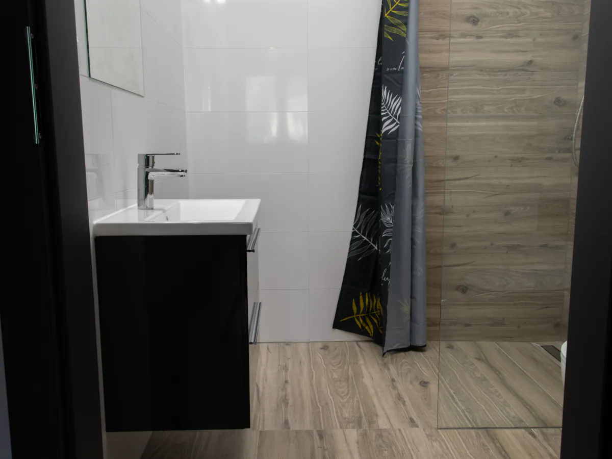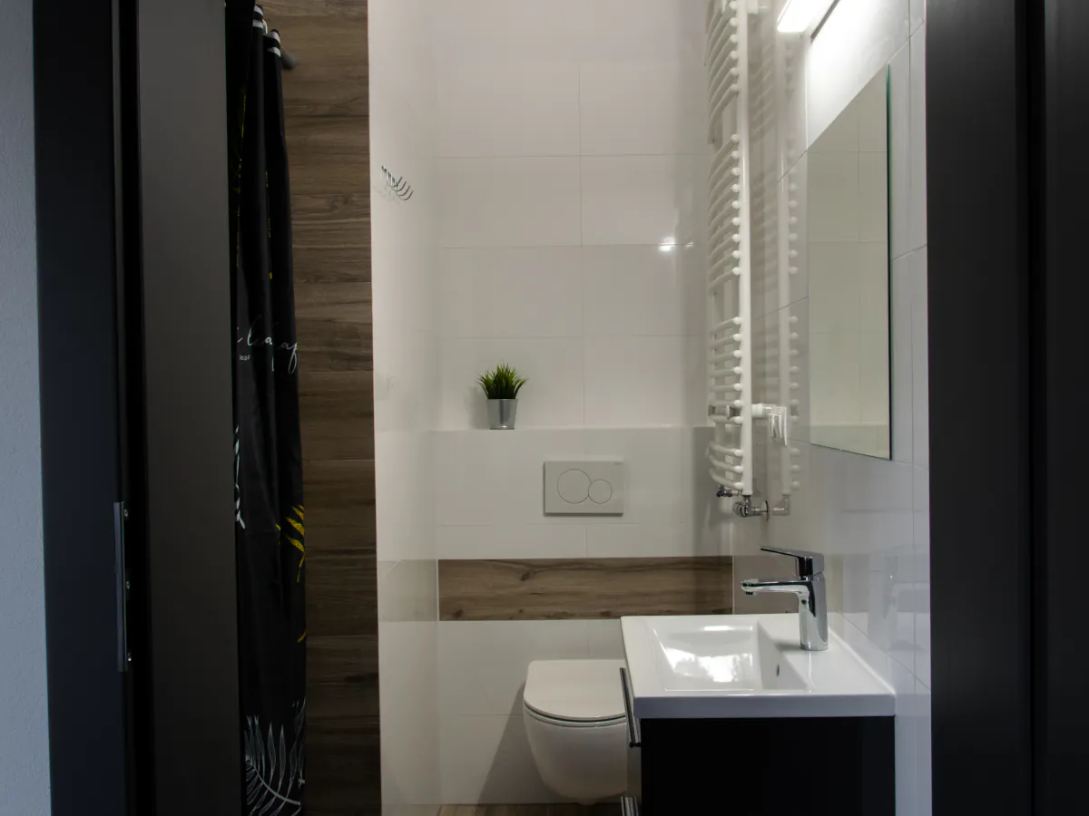 W ofercie mamy również pokoje z łazienką na piętrze. W takim wariancie Goście mają dostęp do oddzielnej toalety oraz wspólnej łazienki i aneksu kuchennego, które dzielone są z dwoma lub trzema innymi pokojami.